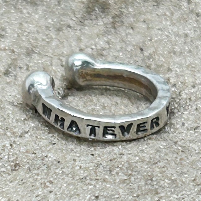 小耳に罵詈雑言を ”WHATEVER YOU SAY” 「勝手に言ってろ」 と刻まれたイヤーカフ Brand : BIGBLACKMARIA Material silver 925 Weight about 1.5g Size φ14mm 耳たぶをひっぱり耳の端の薄いところからイヤーカフを通し、 つけたい位置にスライドさせてください。 緩いようでしたらイヤーカフを少し締めてみてください。