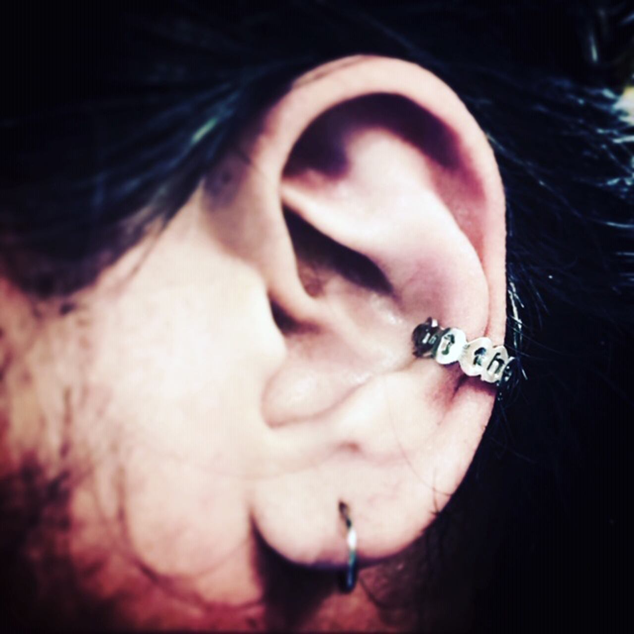 耳たぶをひっぱり耳の端の薄いところからイヤーカフを通し、